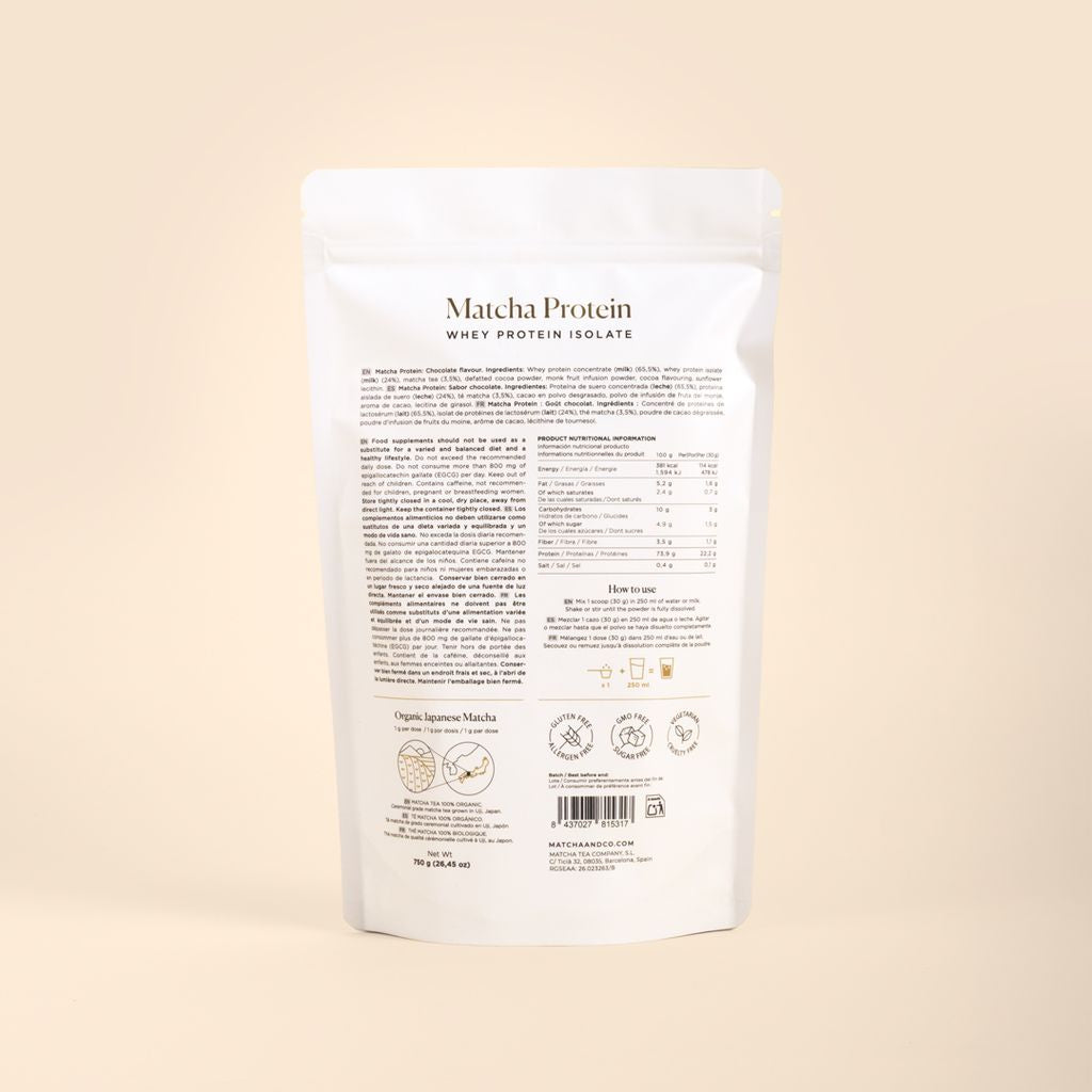 Matcha Protéine contient 750 grammes, ce qui équivaut à 25 doses de 30 grammes.